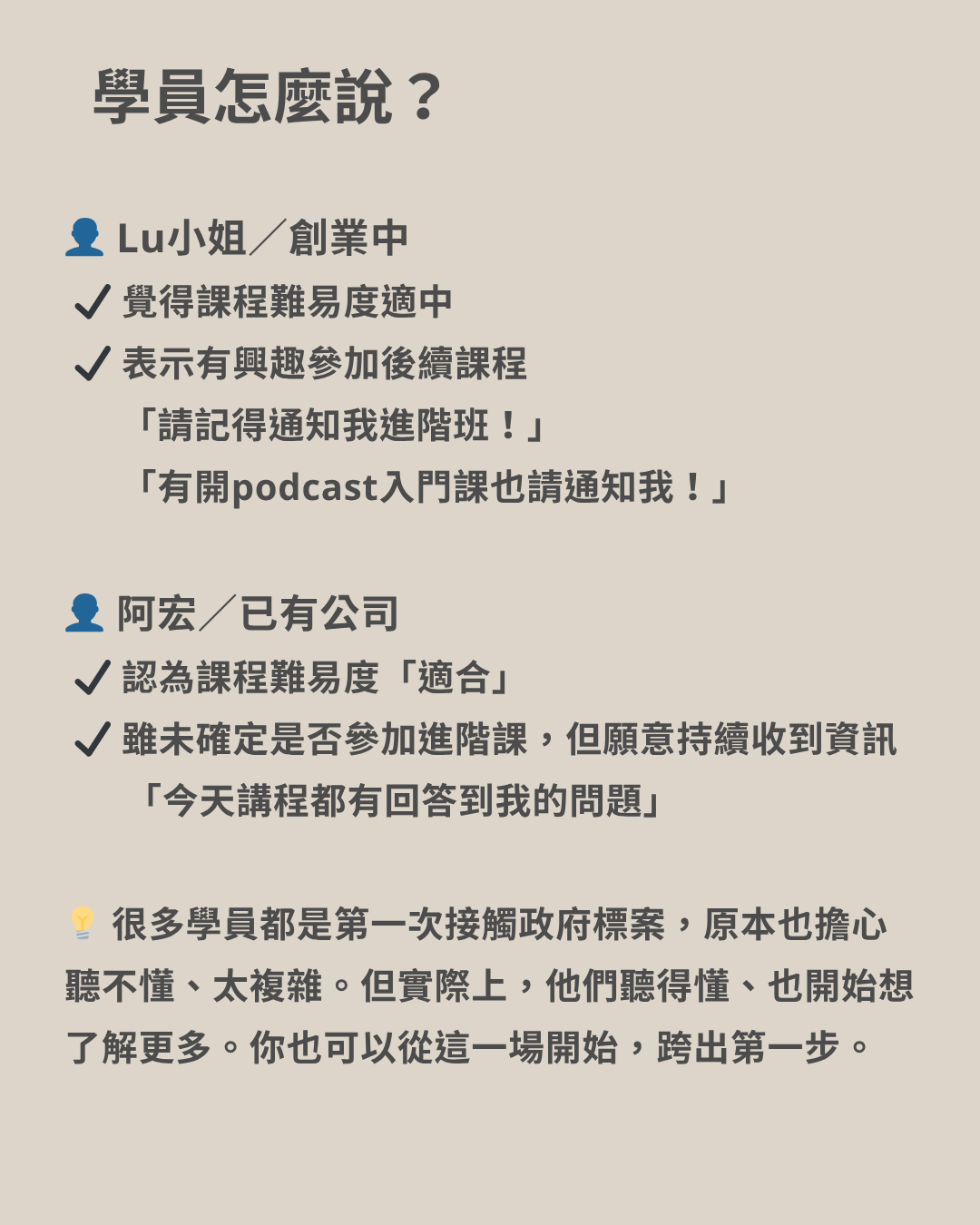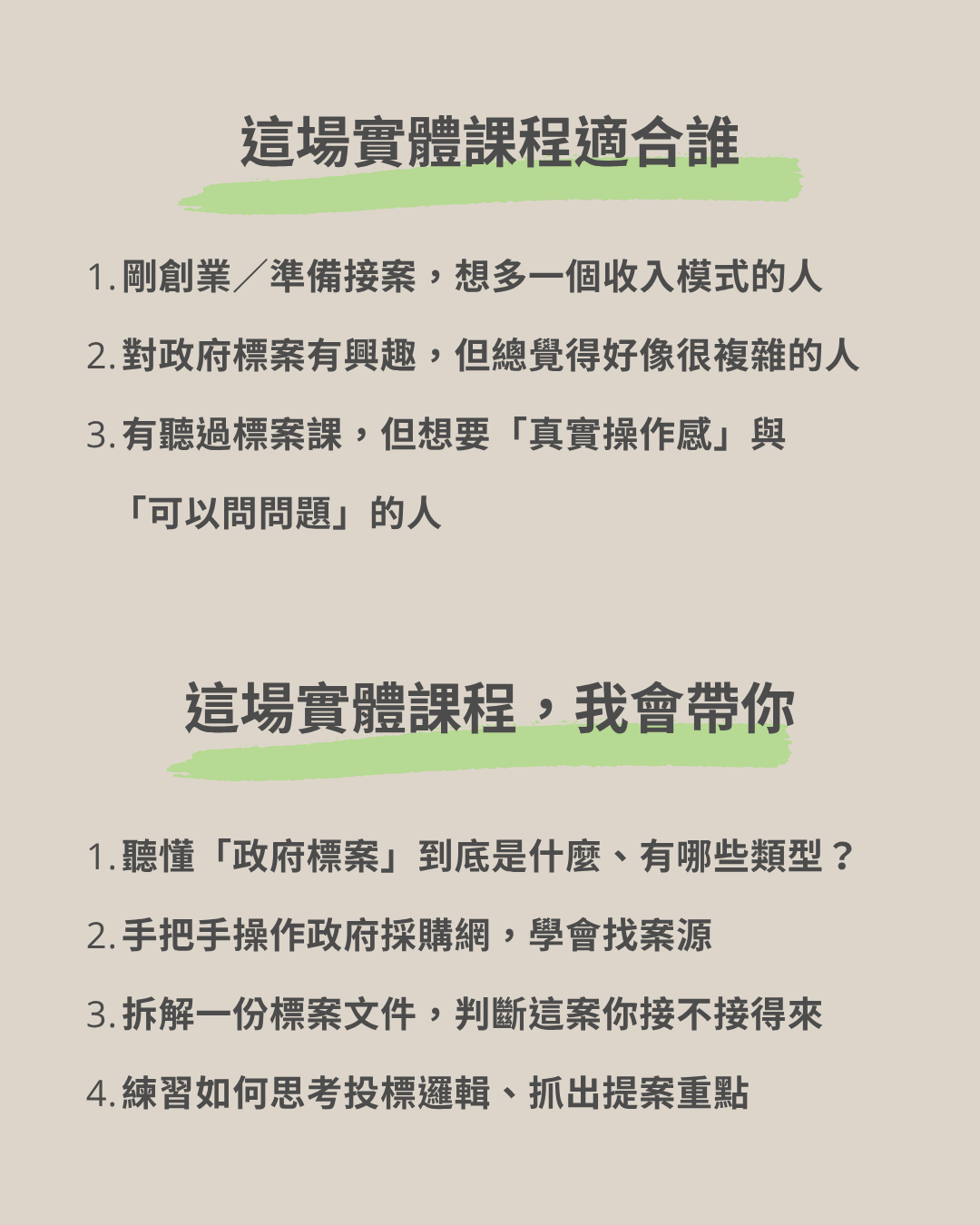 每月限量開課,適合標案新手、創業者、自媒體接案者。